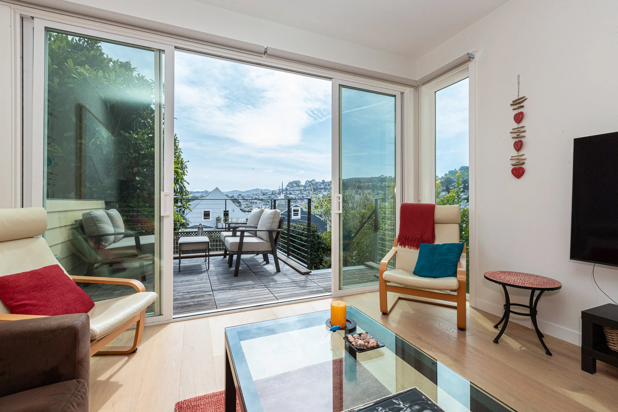 This residence in Noe Valley was dramatically improved by a full interior gut and renovation that brought views, light and space to the flat. Interior non load bearing walls were removed and the living spaces extended to the south exterior wall with new sliding doors, west window, and a deck connecting the interior spaces to the south garden.